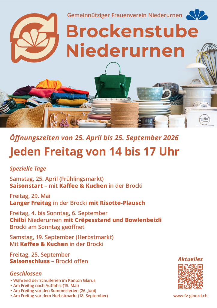 Das Brocki Niederurnen finanziert sich durch Ihre gespendeten Gegenstände, die von Vereinsmitgliedern ehrenamtlich zu fairen Preisen verkauft werden. Der gesamte Erlös kommt sozialen Projekten im Dorf zugute.